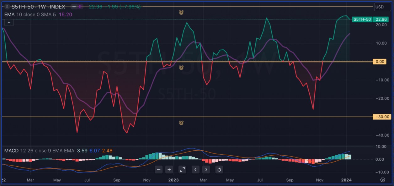 株価指数は年初の下落から力強く反発して年初の価格に戻っています。ただし、50日移動平均線を超えている銘柄の割合が買われ過ぎの水準から下落して下落トレンドに入っており、短期的に下落している銘柄が増えてきていますので、スイングトレードのポジションを大きくするにはややリスクが高めな状況に見えます。