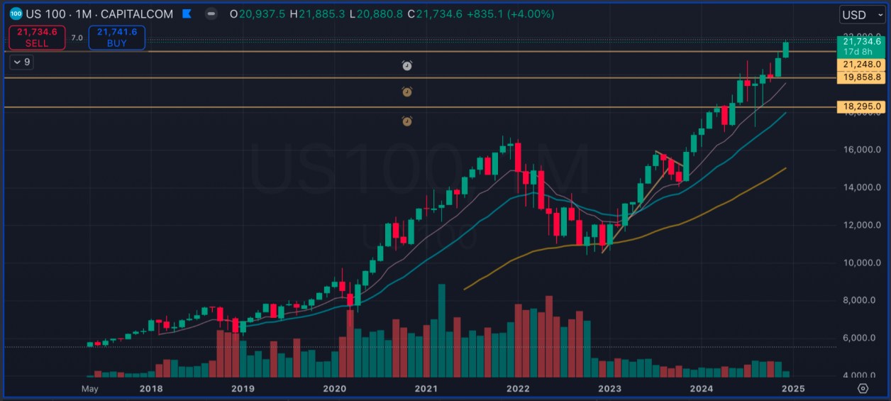 ダウの月足チャートです。12月の騰落率は-2.46%となっており、ナスダックとは対照的に弱い動きとなっています。
