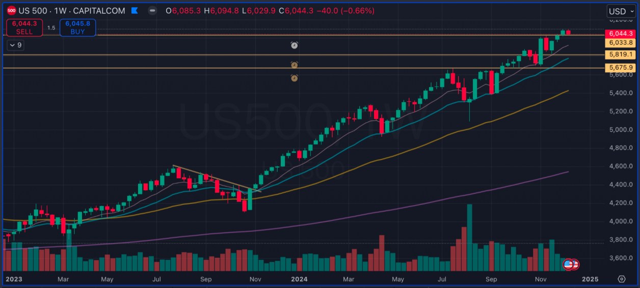 先週はGOOGL、TSLA、AVGO、ARM、BAが力強く上昇しました。一方で、ソフトウェア(ORCL、ADBE)、半導体(NVDA、AMD)、電話通信(TMUS、CMCSA、CHTR)、住宅建築(DHI、LEN)、製薬(LLY、BMY)、健康保険(UNH、CVS、CI)、鉄鋼(NUE、STLD)が弱いです。